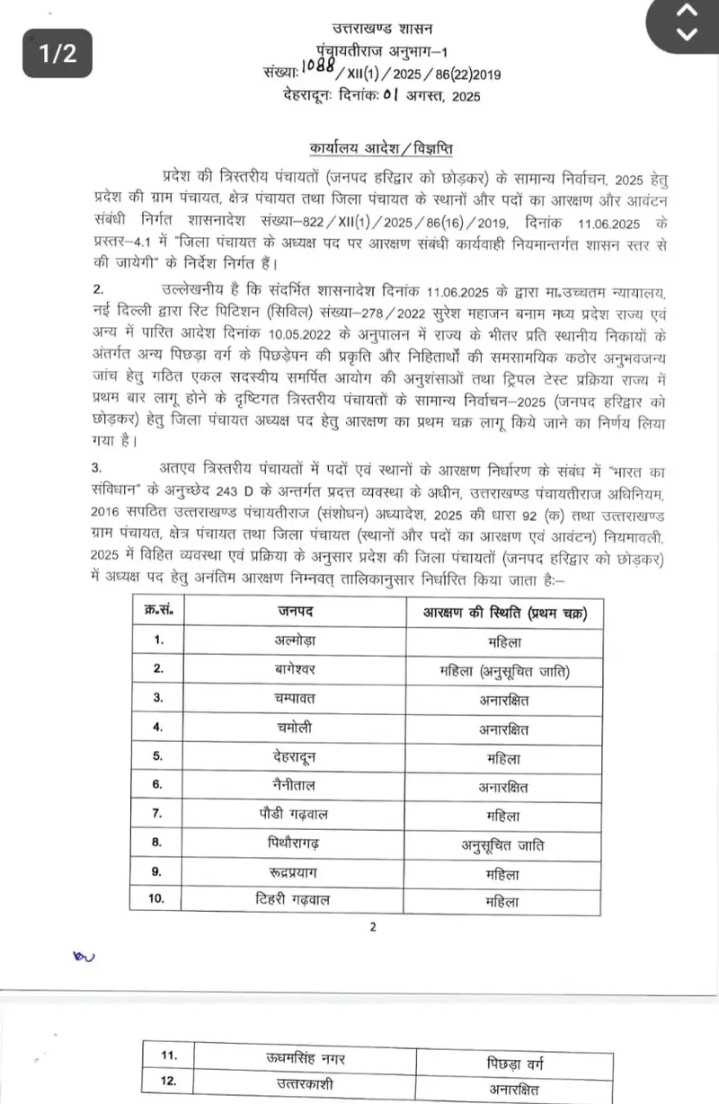 उत्तराखंड जिला पंचायत अध्यक्ष पदों पर आरक्षण की अनंतिम सूची जारी