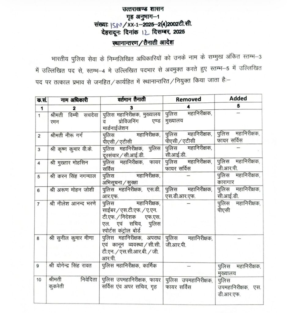 उत्तराखंड पुलिस महकमे में बड़ा फेरबदल, कई IPS अधिकारियों के तबादले