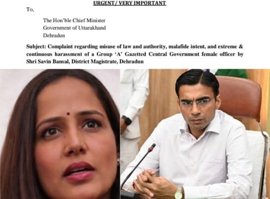 शिकायत पत्र में आरोप लगाया गया है कि देहरादून के जिलाधिकारी सविन बंसल द्वारा कानून का दुरुपयोग करते हुए एक महिला केंद्रीय अधिकारी को मानसिक रूप से प्रताड़ित किया गया। पत्र की प्रतिलिपि राज्यपाल, राष्ट्रीय महिला आयोग सहित अन्य उच्च अधिकारियों को भी भेजी गई है।